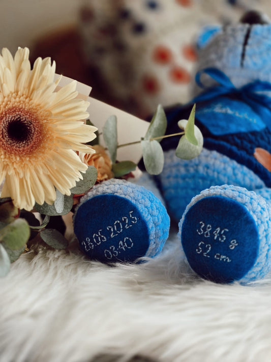 Rokām tamborētas rotaļlietas ierobežots daudzums: mīkstas, sirsnīgas un personalizējamas (vārds/datums). Lieliska dāvana jaundzimušajam un bērnistabai.
