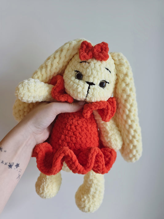 Tamborēta plīša zaķene ar sarkanu kleitiņu, 37 cm (Roku darbs)