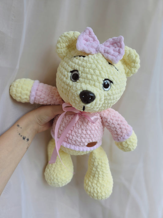 Tamborēts plīša lācēns ar rozā džemperīti, 43 cm (Roku darbs)