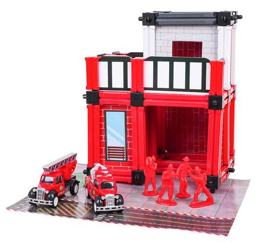 Ugunsdzēsēju depo būvējamais komplekts ar mašīnām un figūriņām