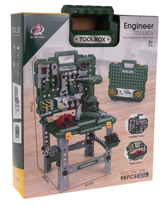 MEGA 2-in-1 instrumentu darbagalds/koferis (98 detaļas) ar urbjmašīnu, 3+