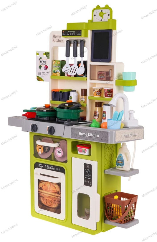 Zaļa bērnu rotaļu virtuvīte ar tvaika efektu, gaismas un skaņas funkcijām, 63 piederumi