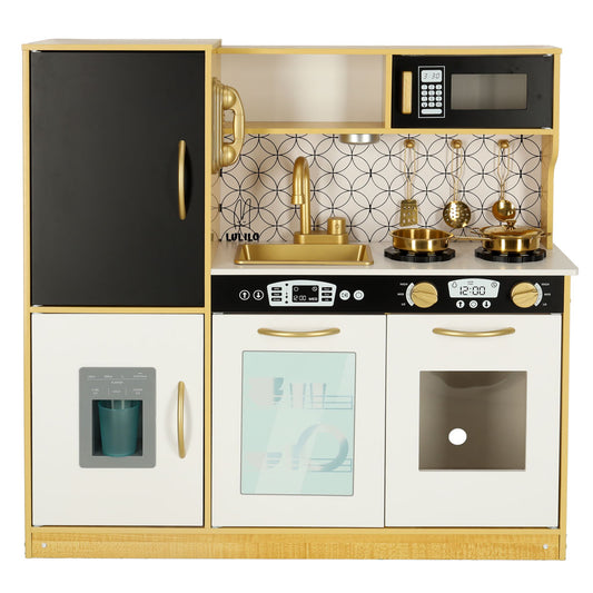 Koka virtuve bērniem melnbalta ar zelta detaļām + LED un skaņa (MDF, 3+)