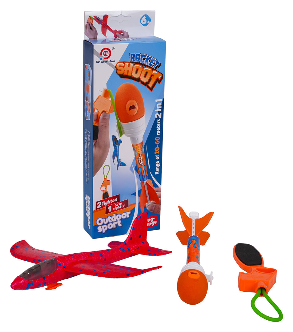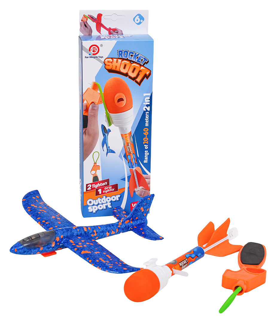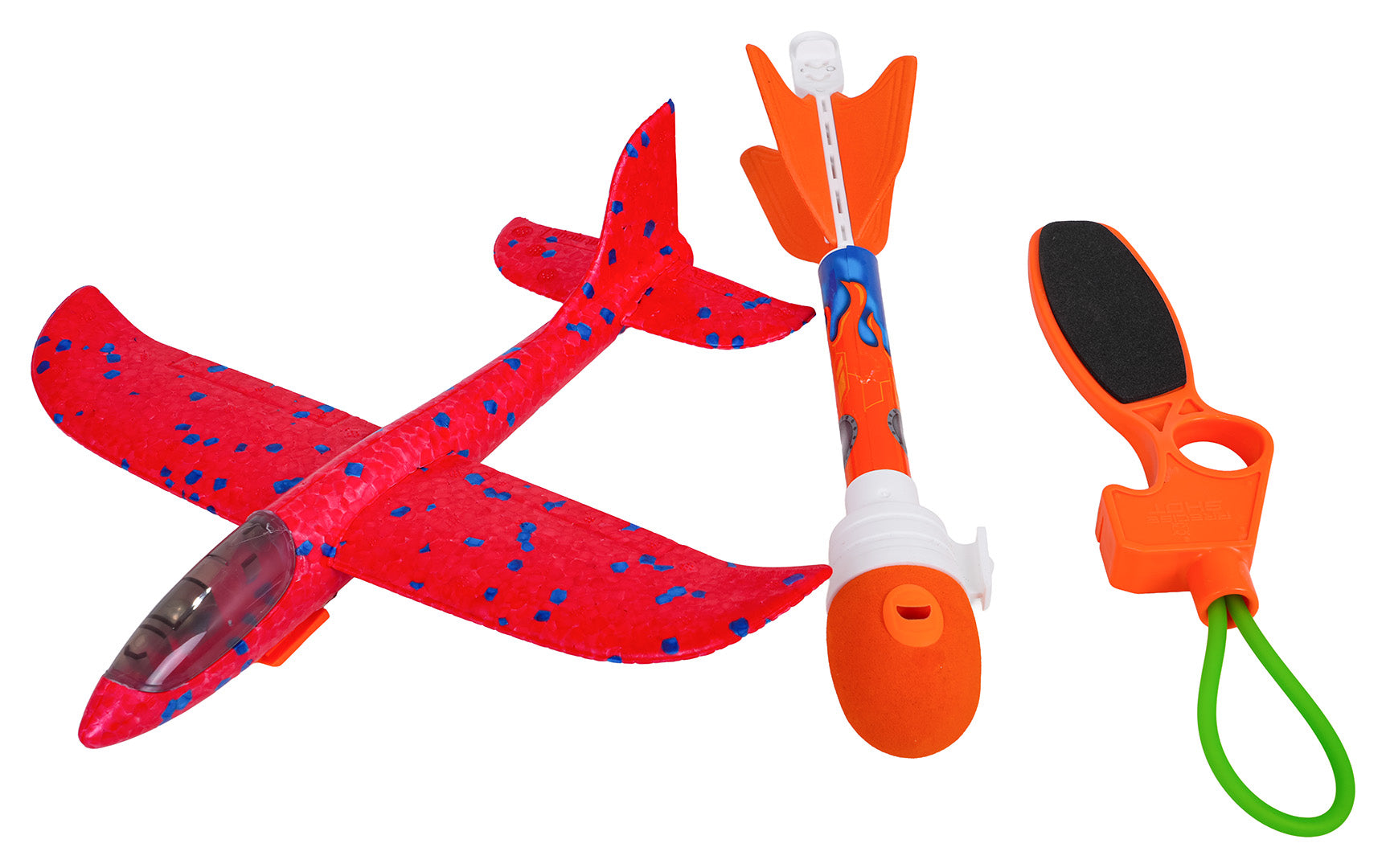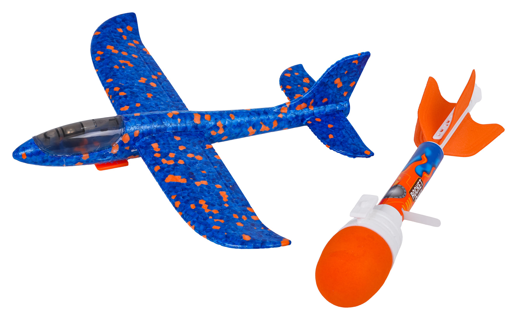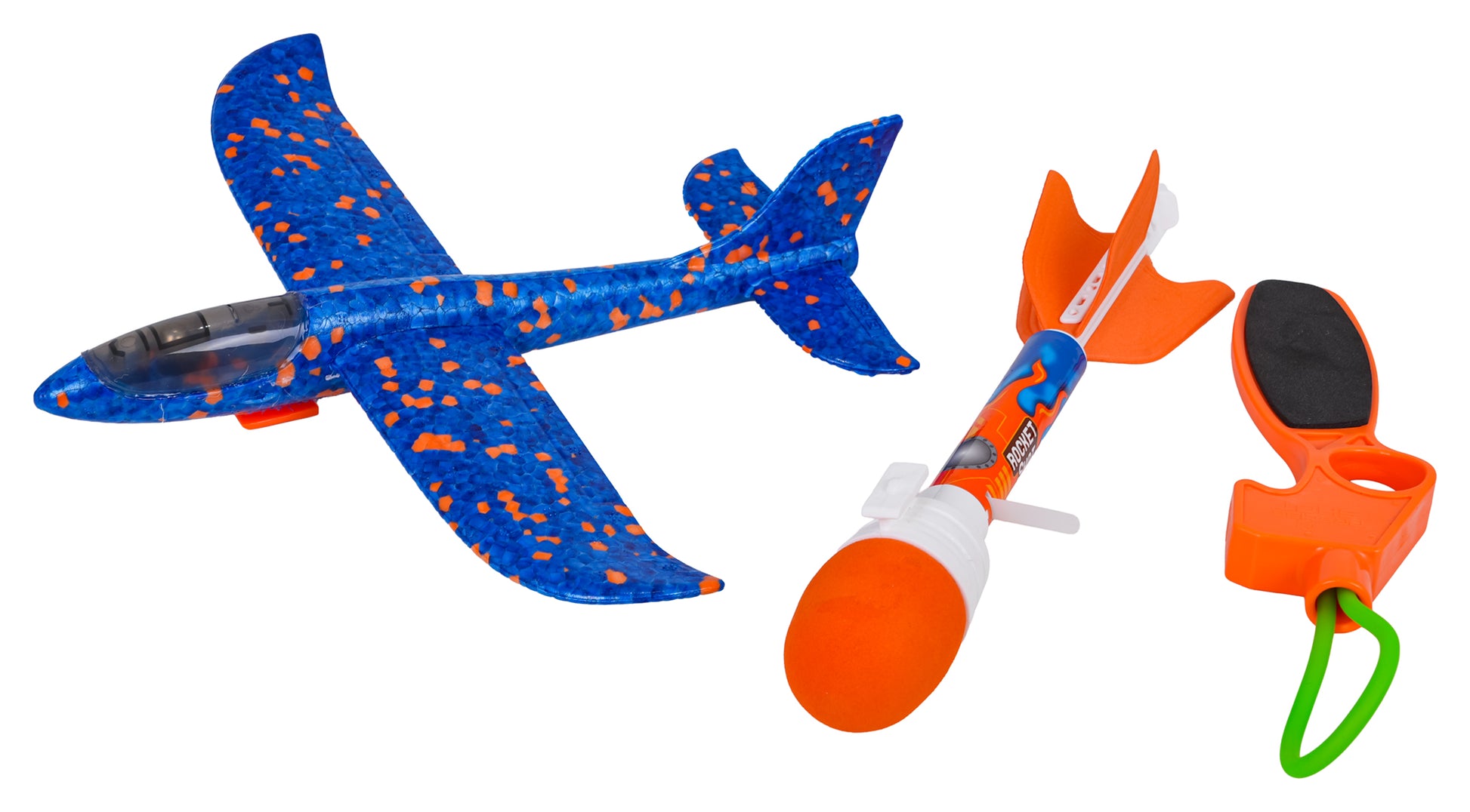 Šis 2-in-1 “Rocket Shoot” komplekts ir ideāls aktīvām rotaļām ārā – parkā, pagalmā vai stadionā. Komplektā ir vieglā putu lidmašīna (planieris) un putu raķete ar mīkstu uzgali, ko var palaist ar katapultu un elastīgo lenti. Bērns vienkārši piestiprina gumiju, atvelk un atlaiž – un lidaparāts dodas gaisā!
