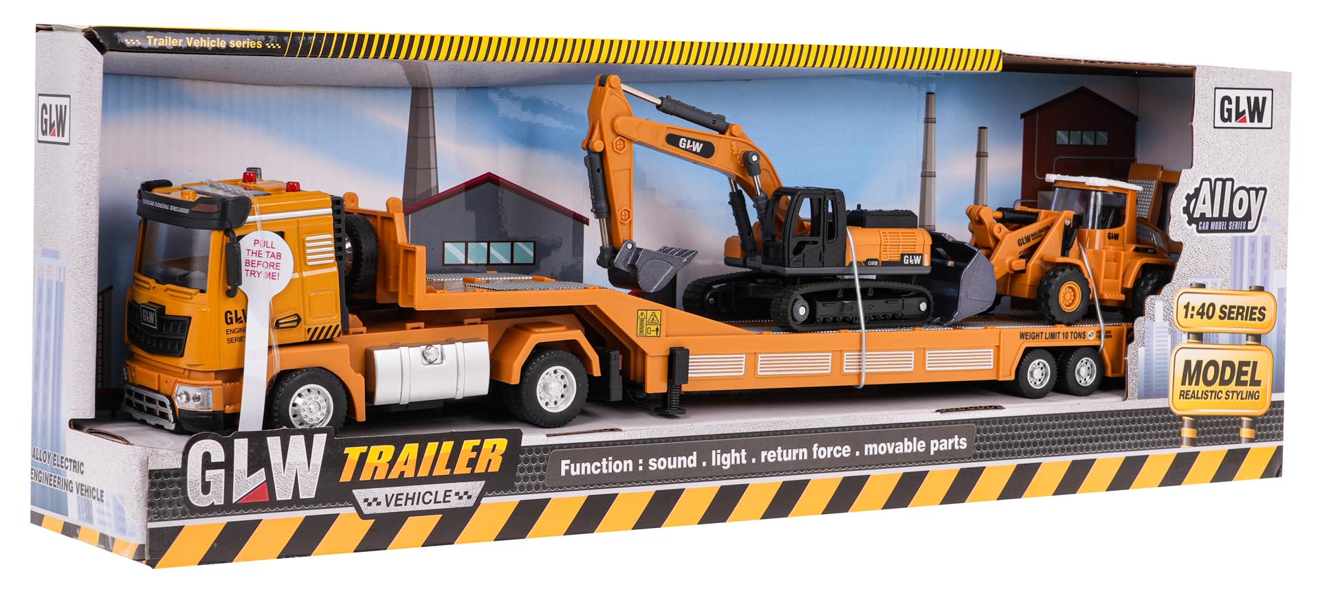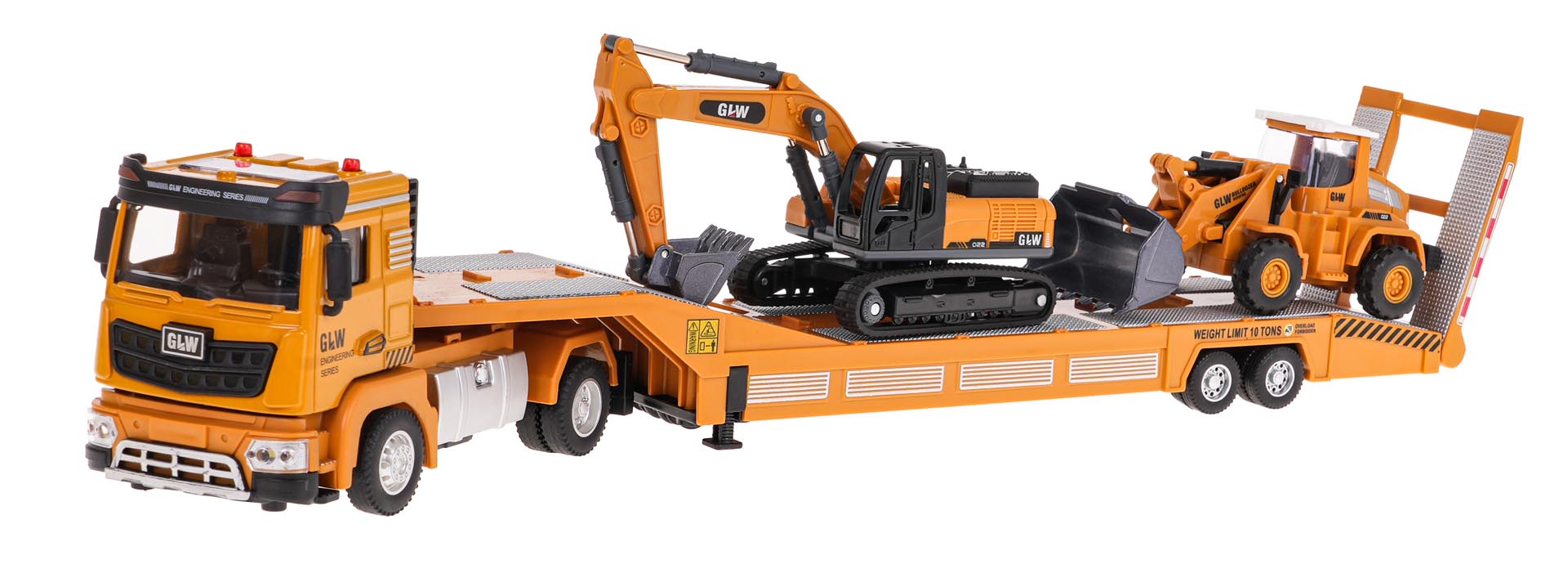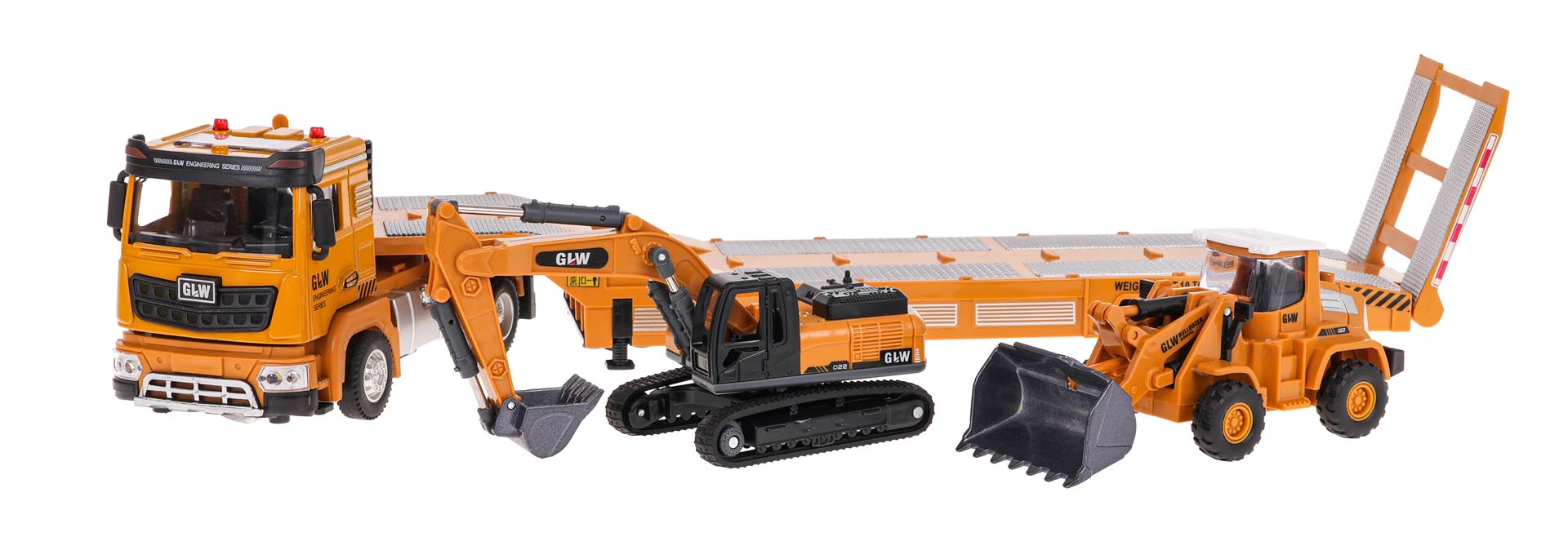 Šis liela izmēra celtniecības transportlīdzekļu komplekts ar piekabi ir lieliska izvēle bērniem, kuri aizraujas ar smago tehniku un būvdarbu pasauli. Komplektā ietilpst kravas automašīna ar noņemamu piekabi, ekskavators un buldozers, kas ļauj izveidot reālistiskus būvlaukuma scenārijus mājās vai ārā.