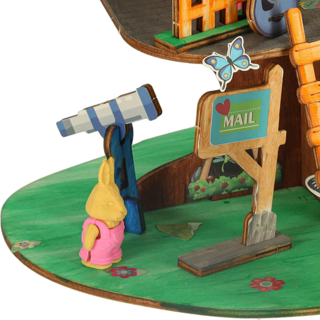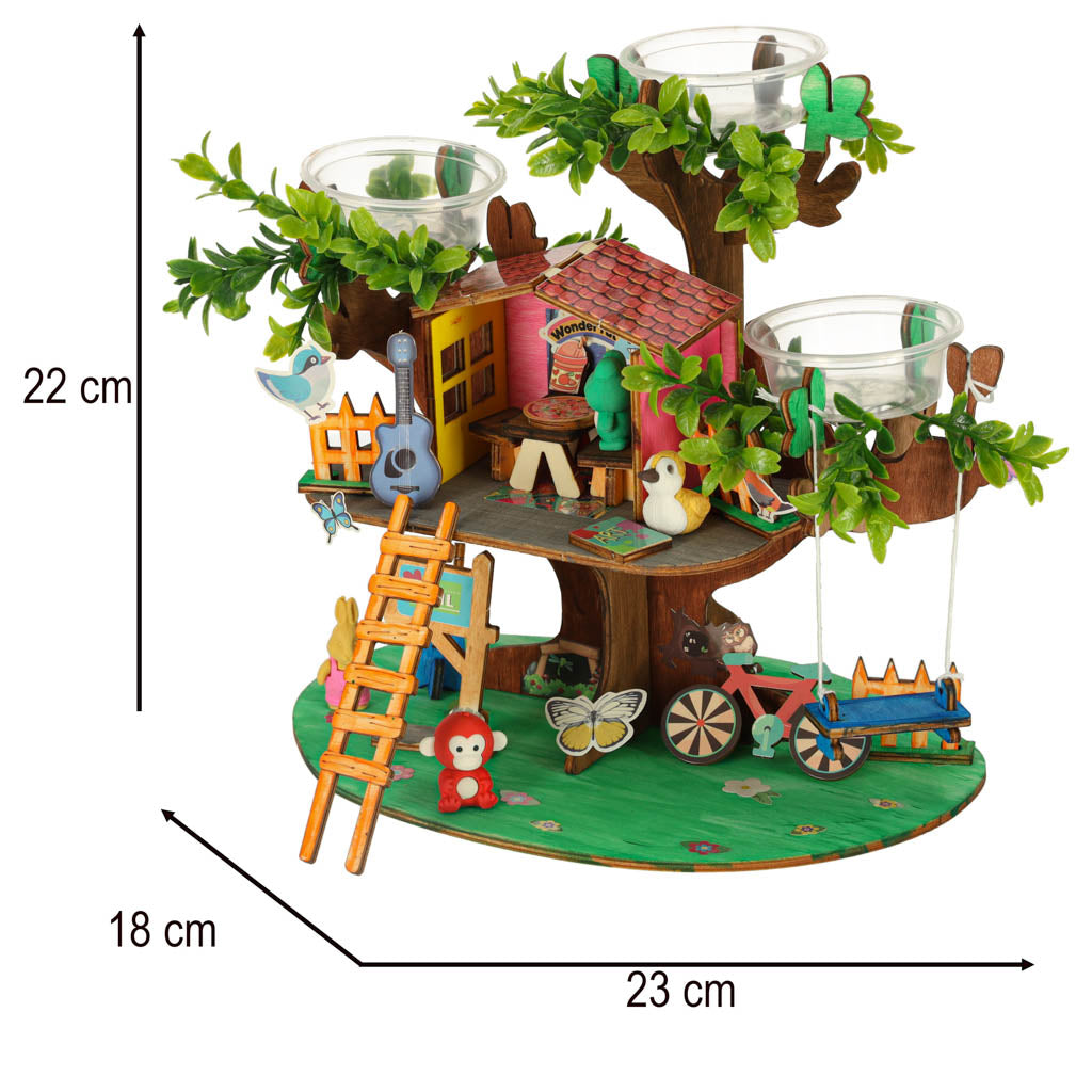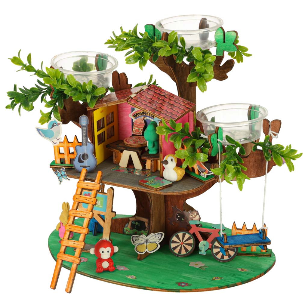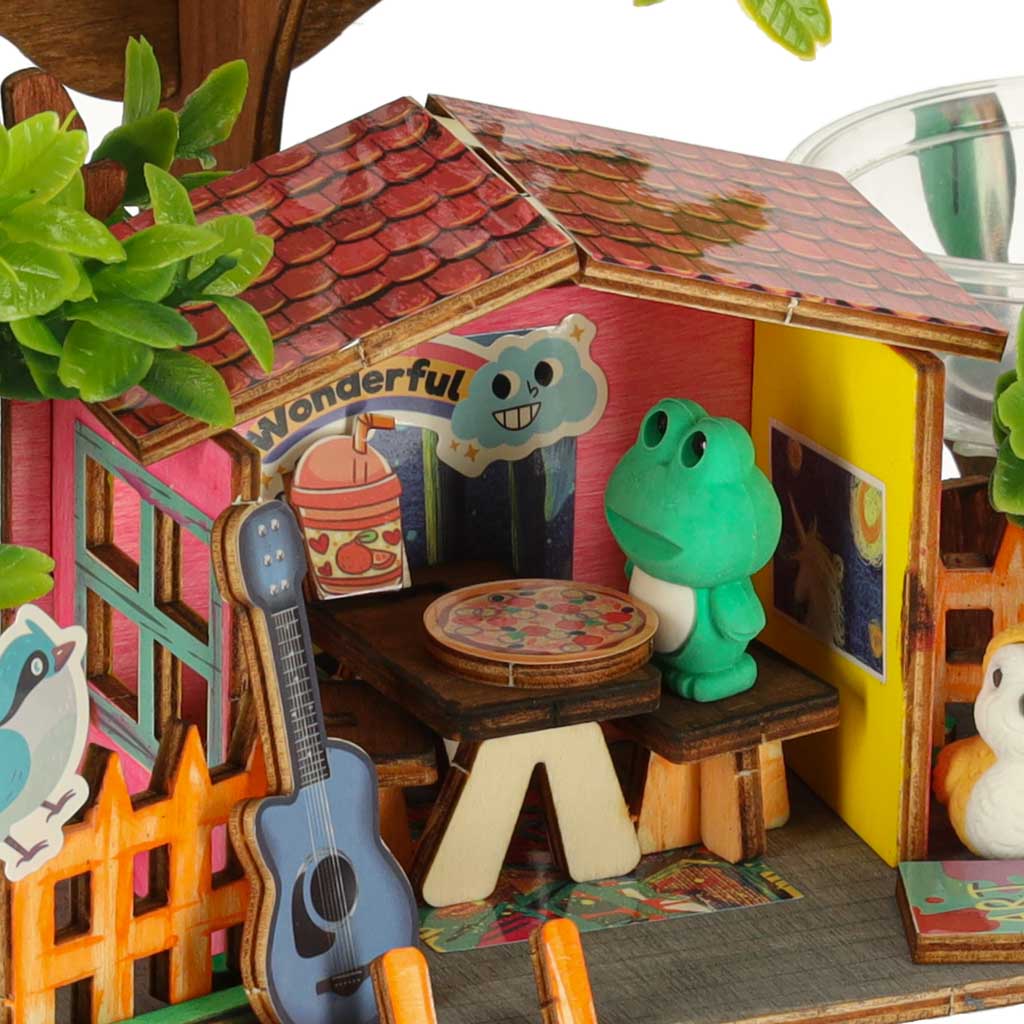 Radošais koka koka mājas komplekts ir lieliska dāvana bērniem, kuriem patīk būvēt, krāsot un veidot savas pasaules. No koka detaļām bērns pats uzbūvē divstāvu namiņu kokā, pievieno kāpnes, velosipēdu, žogu, teleskopu un citus jaukus elementus, bet pēc tam visu izkrāso ar komplektā iekļautajām krāsām. Rezultātā top unikāla koka māja ar pagalmu, kurā saimnieko jautras dzīvnieku figūriņas.