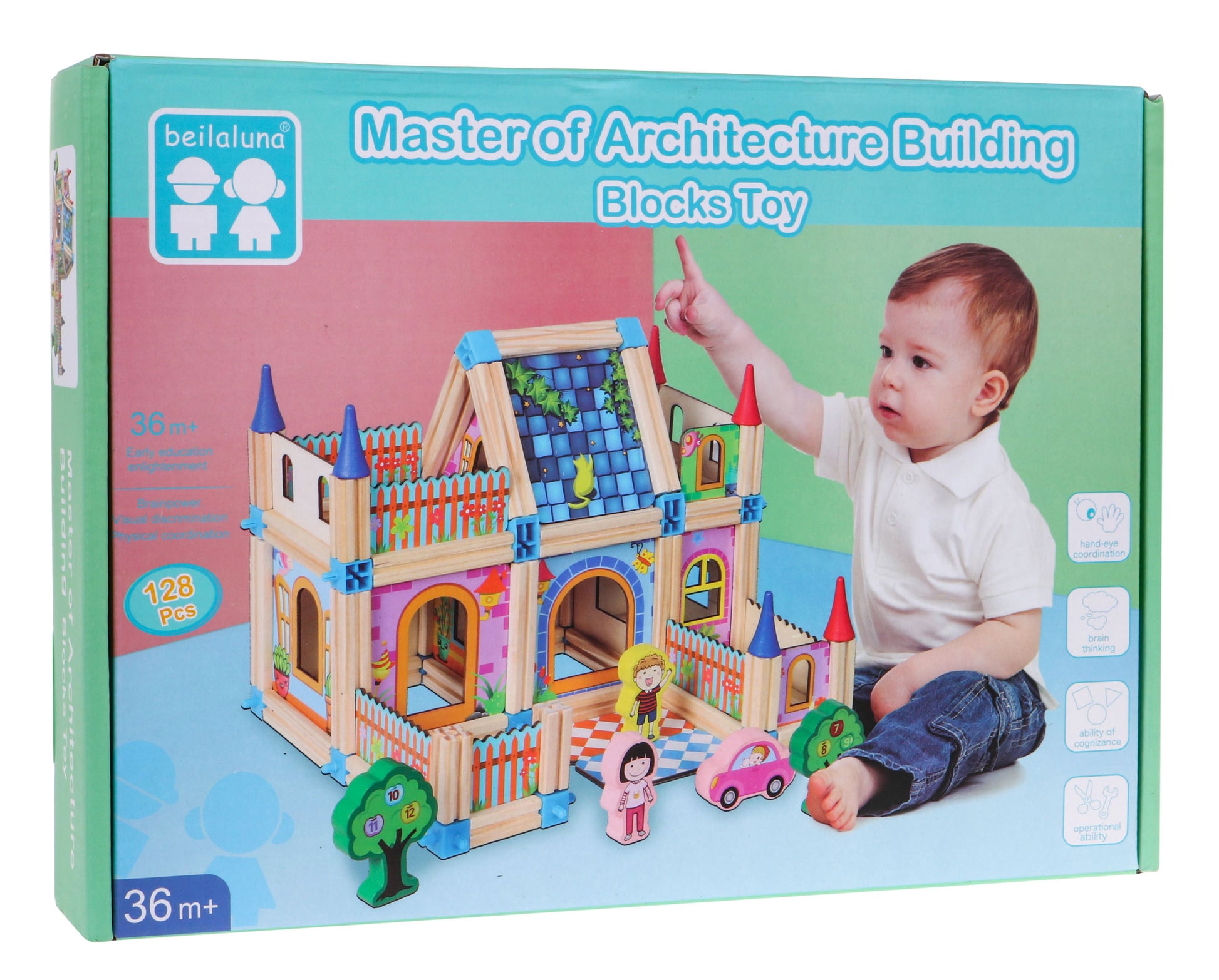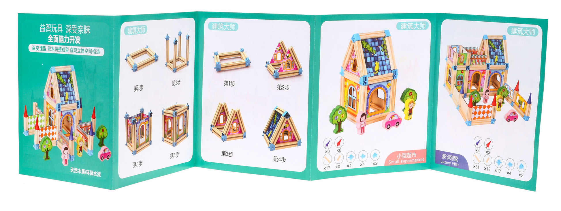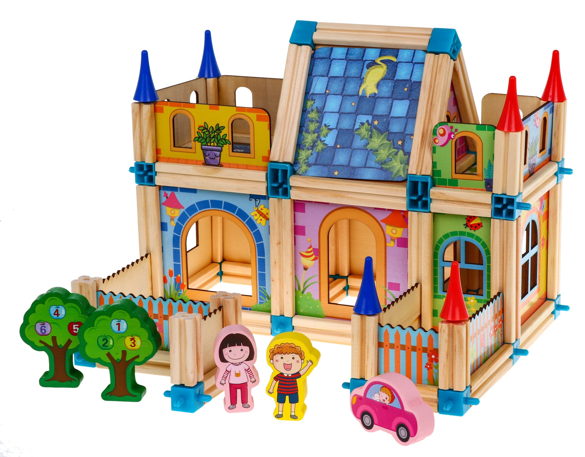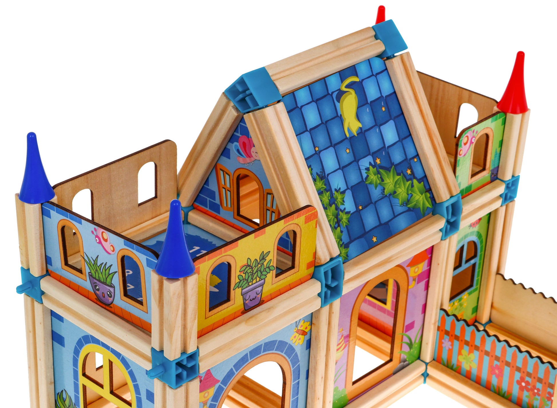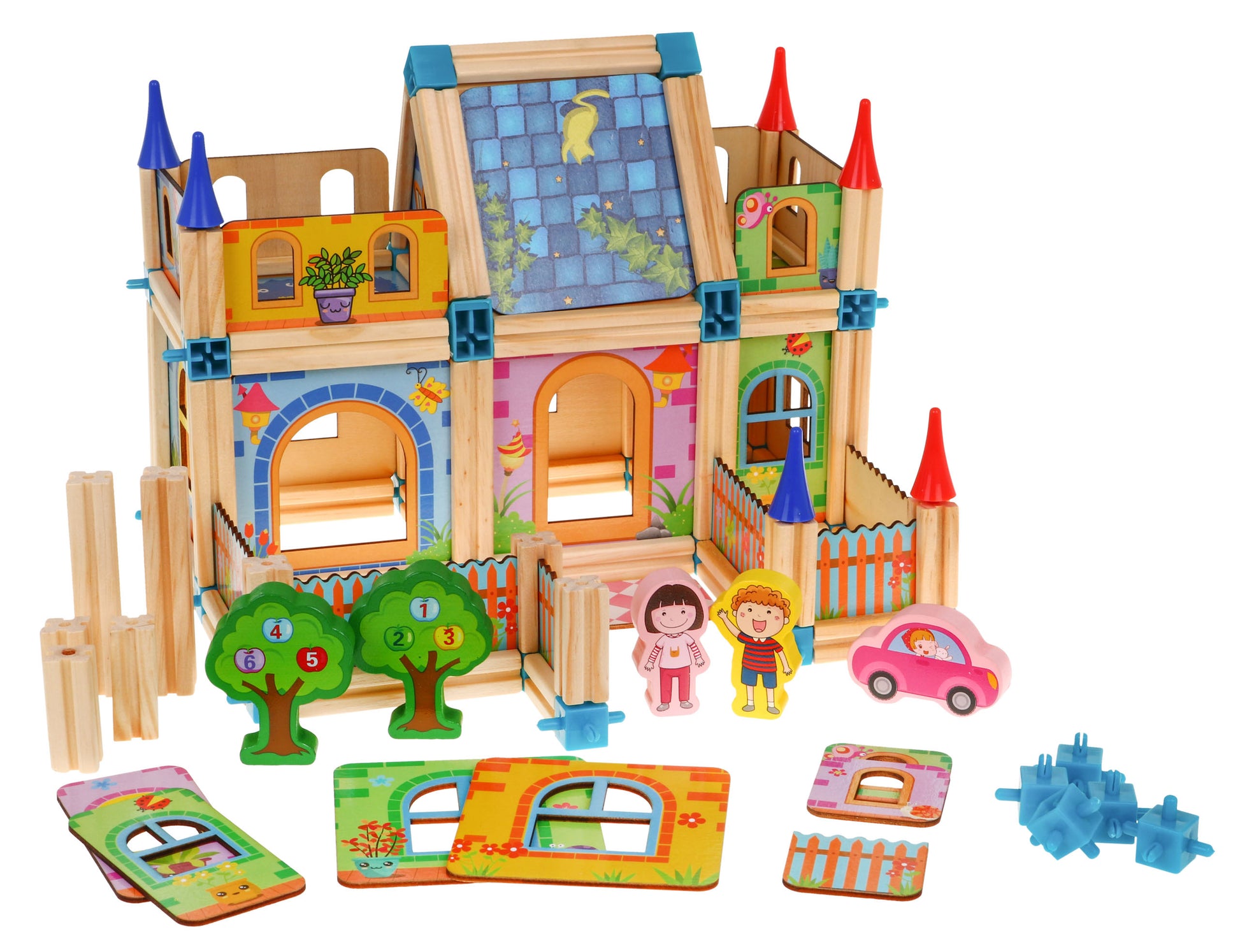 Krāsains konstrukcijas klucīšu komplekts ar koka dizaina elementiem un apdrukātiem “mājas” paneļiem, kas ļauj bērnam uzbūvēt dažādas mājiņas, pagalmus un pat veselu mini pilsētiņu. Komplektā ir 128 detaļas, tostarp dažādu formu būvdaļas, savienotāji un dekoratīvie paneļi ar logiem, durvīm un jumta elementiem.