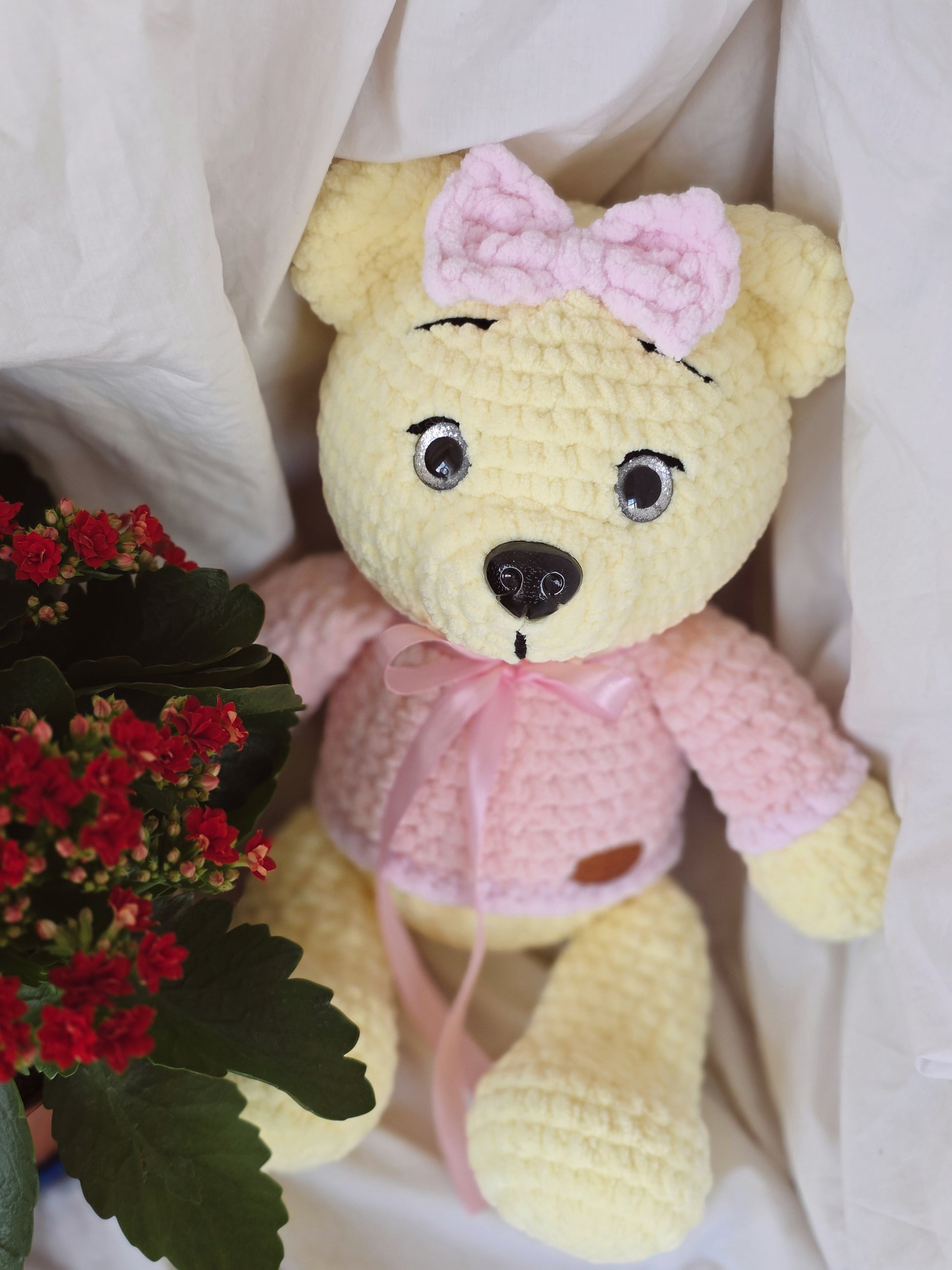 Izmērs: vidējs plīša lācis (aptuveni ~30–35 cm kopējais augstums)