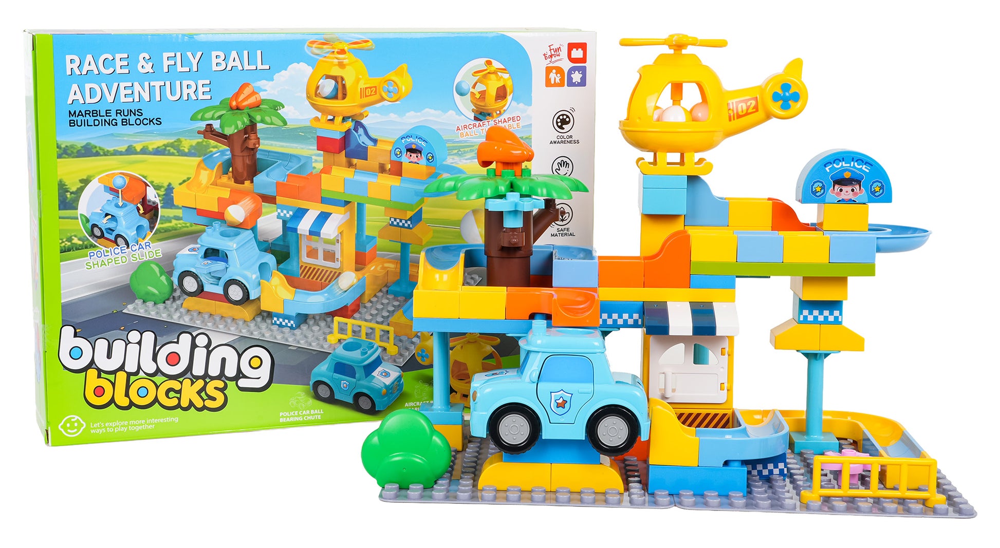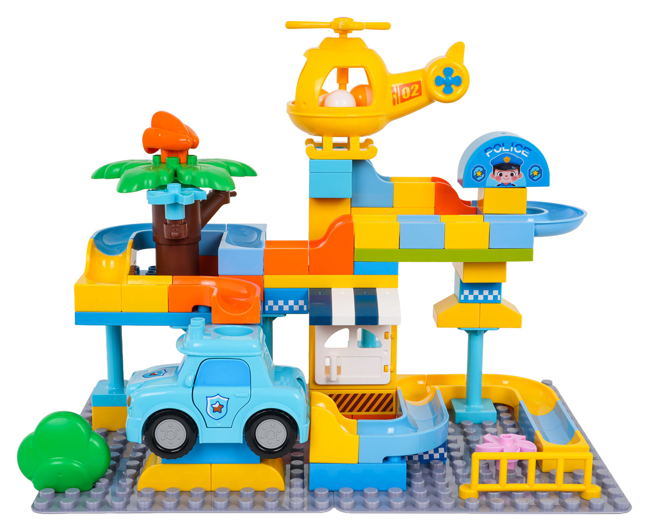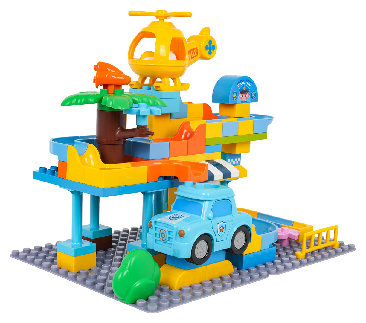 Komplektā ir arī policijas mašīnīte un helikopters, un abiem ir īpašs caurums bumbiņai, lai rotaļa kļūtu vēl interesantāka – bumbiņu var palaist caur transportu un turpināt trasi tālāk. Lielie klucīši ir ērti mazām rociņām, viegli savienojami un veido stabilu konstrukciju.