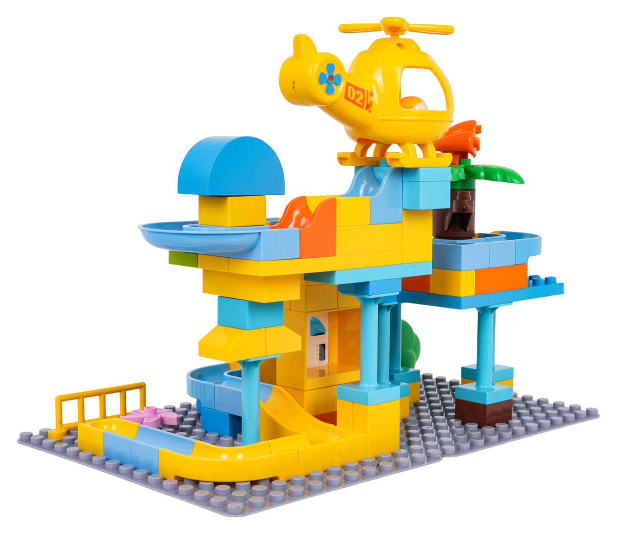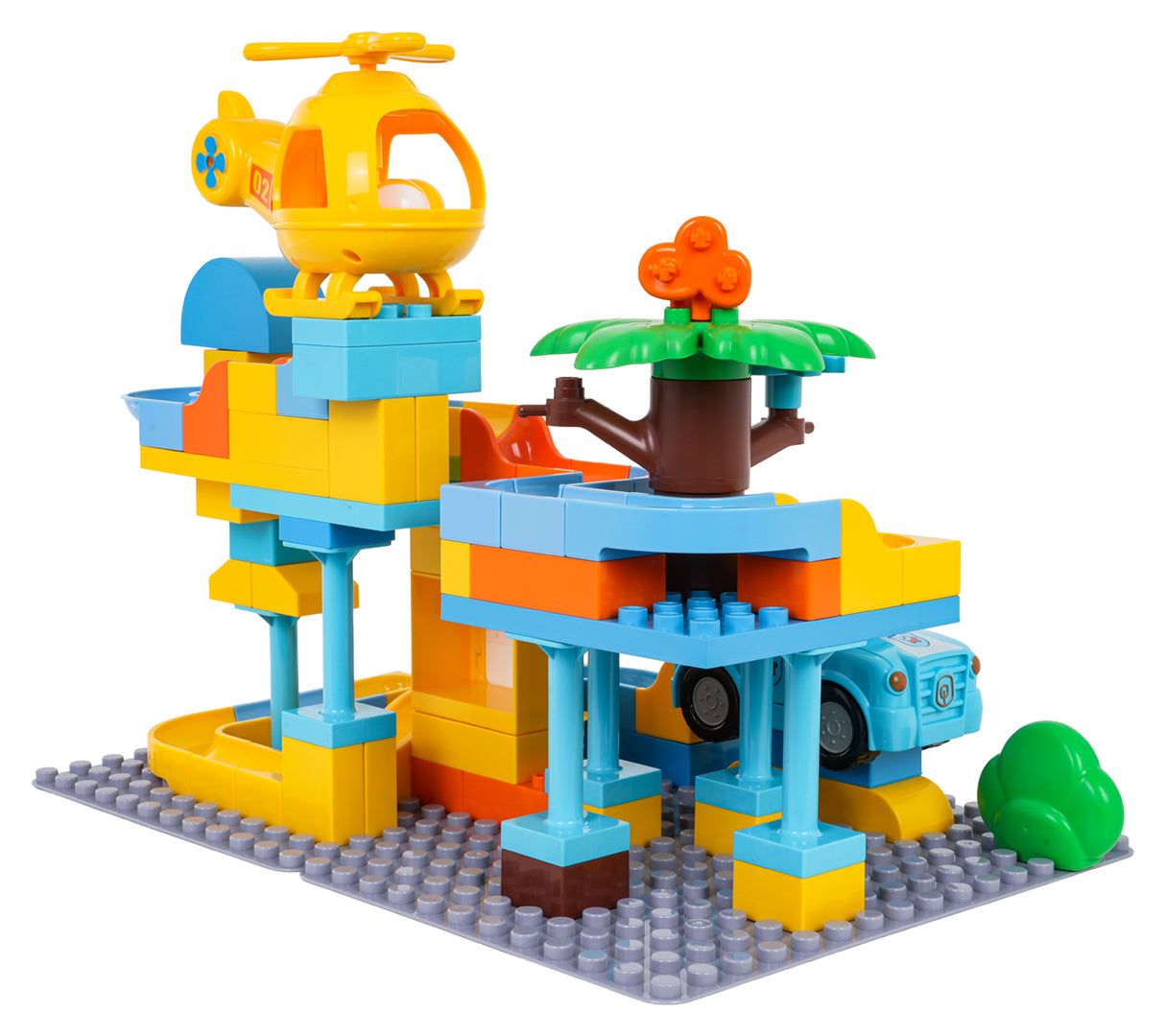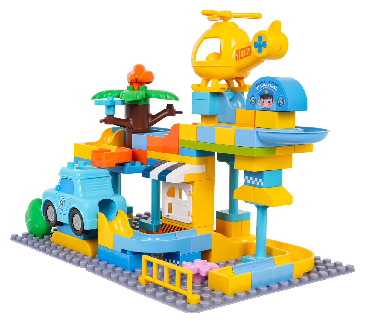 Komplektā ir arī policijas mašīnīte un helikopters, un abiem ir īpašs caurums bumbiņai, lai rotaļa kļūtu vēl interesantāka – bumbiņu var palaist caur transportu un turpināt trasi tālāk. Lielie klucīši ir ērti mazām rociņām, viegli savienojami un veido stabilu konstrukciju.