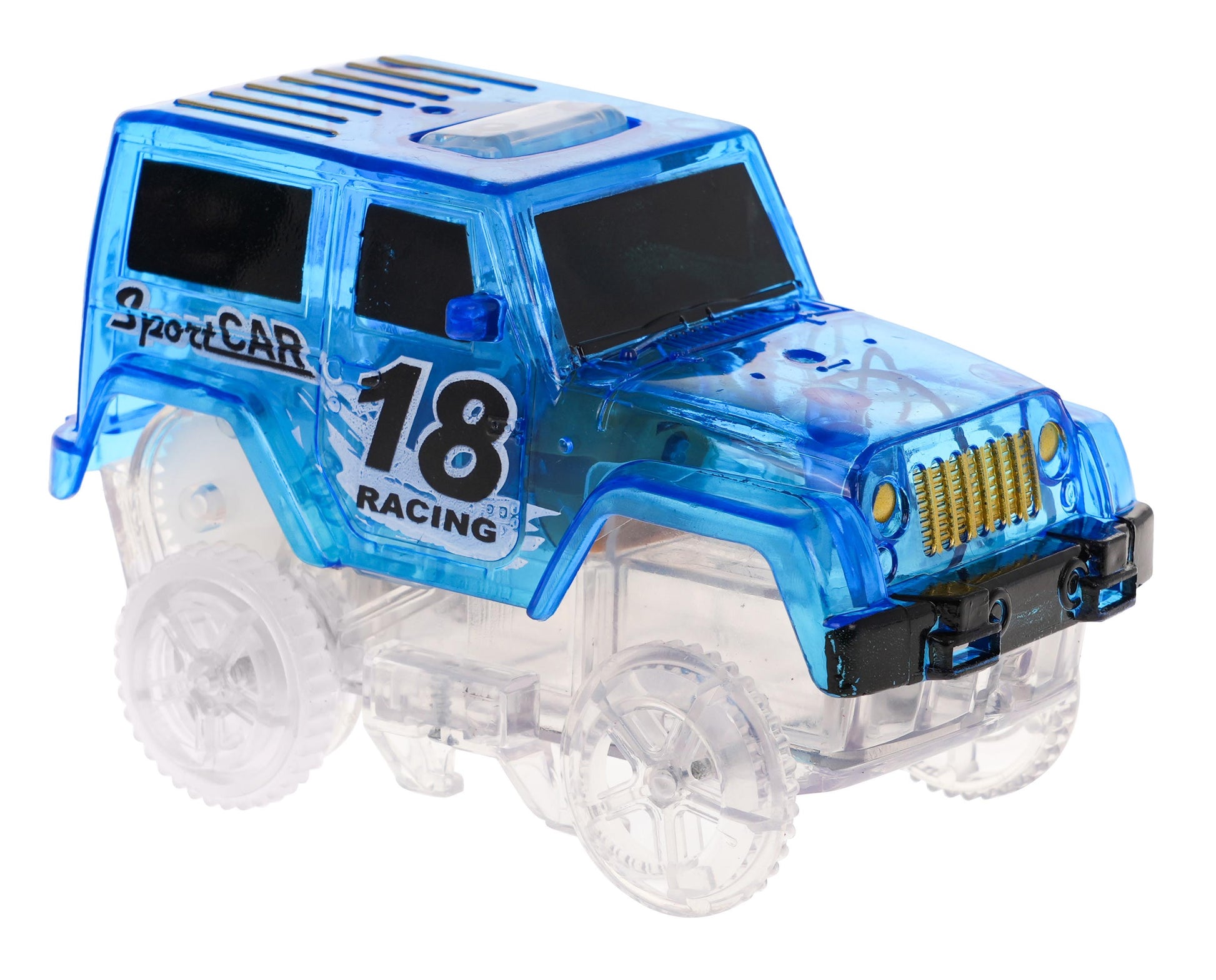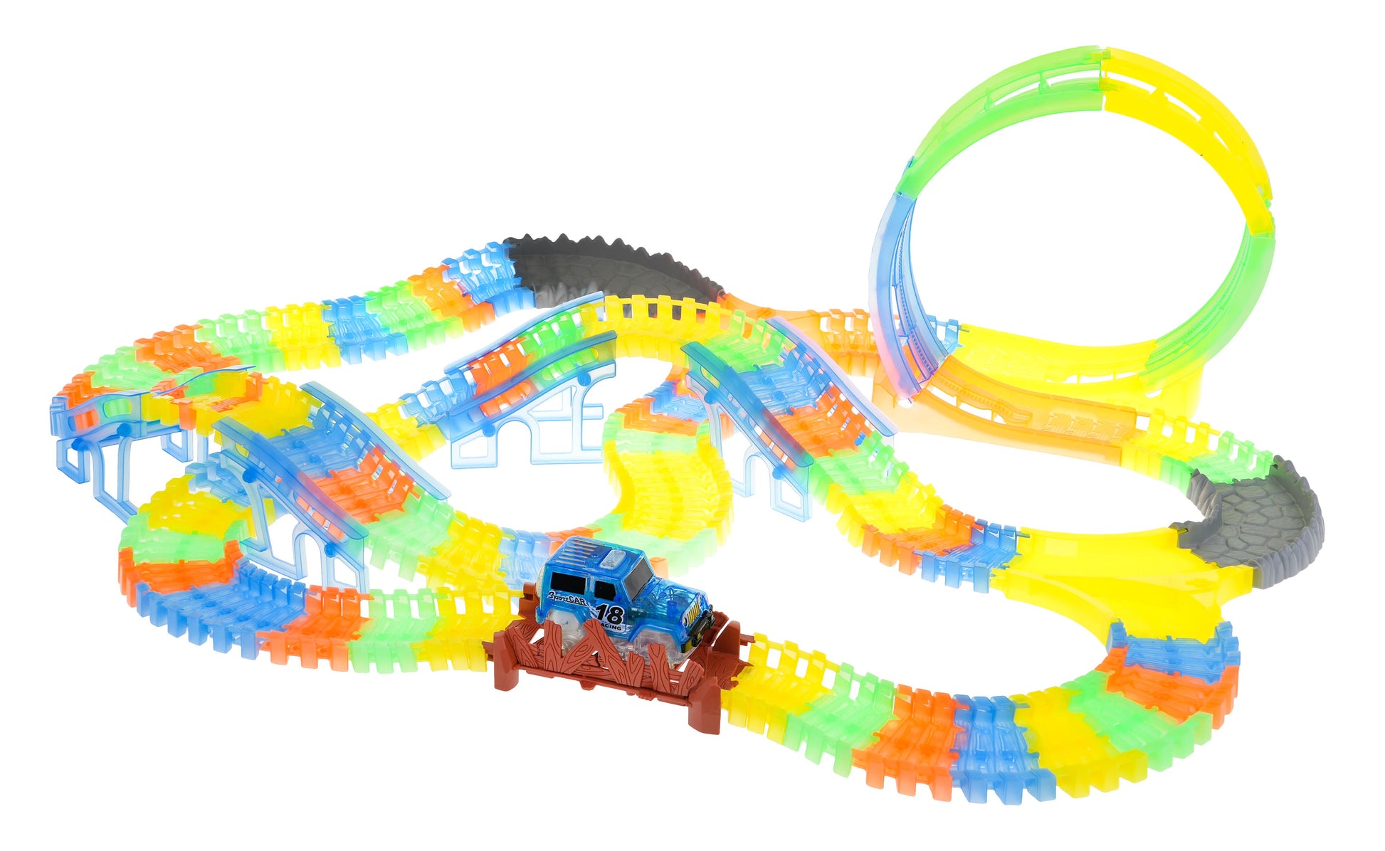 Elastīga, tumsā spīdoša (fluorescējoša) trase ar cilpu un LED apgaismojumu automašīnā – lieliska aktīvām rotaļām bērniem no 3 gadu vecuma.